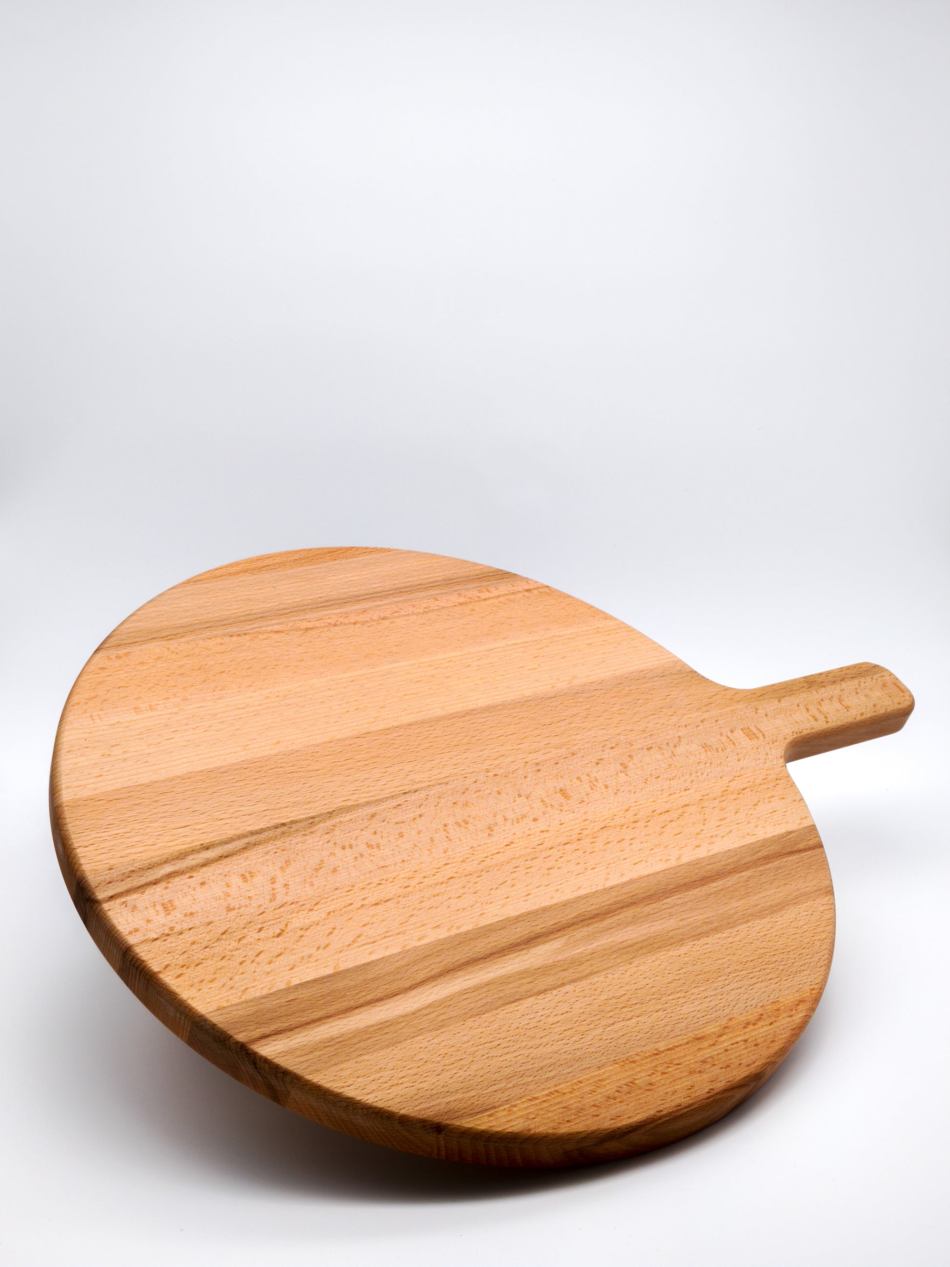 Rundes Brett Ø35cm aus Kernbuche mit ergonomischem Griff. Erfreut alle Pizzabäcker und Hobbyköche.