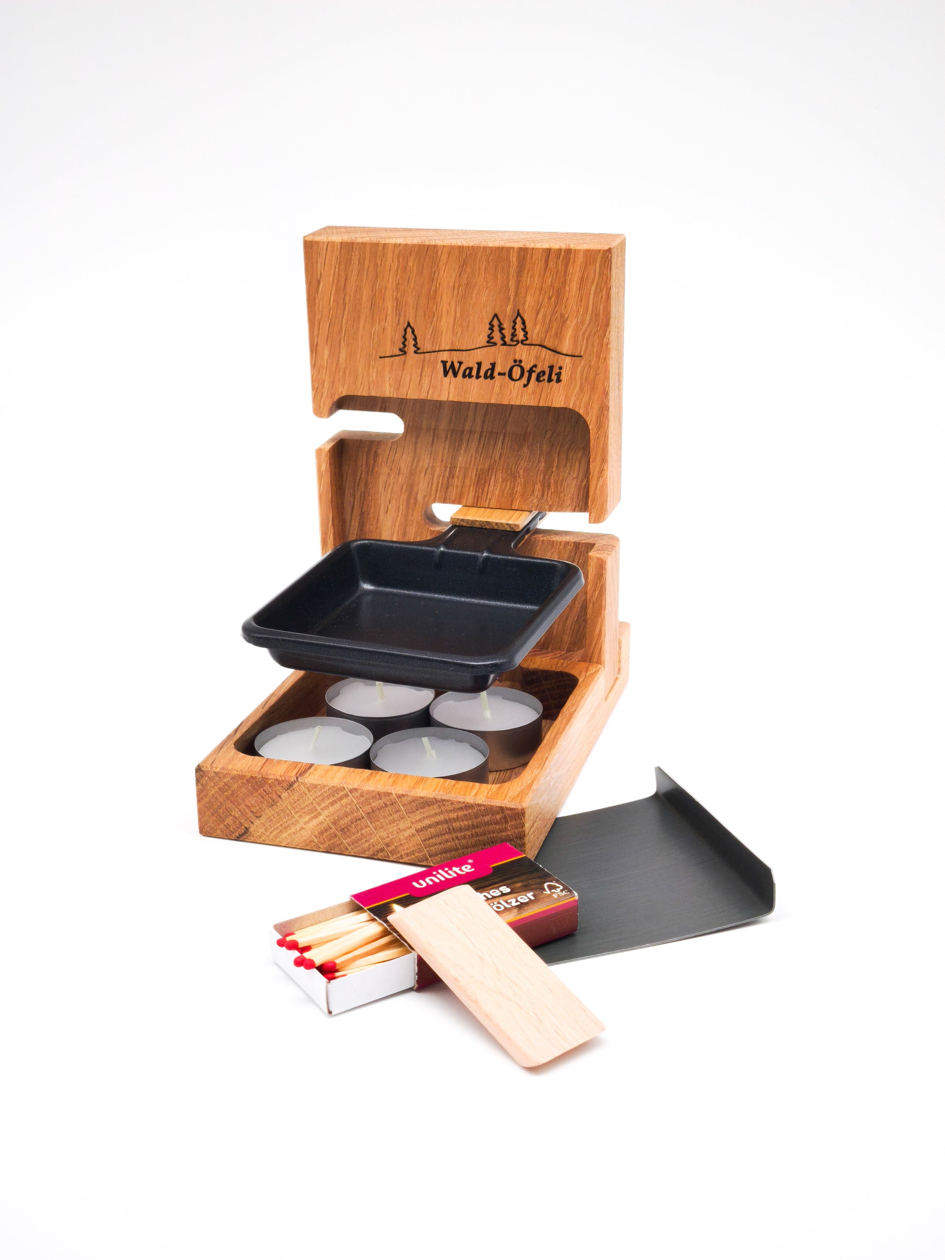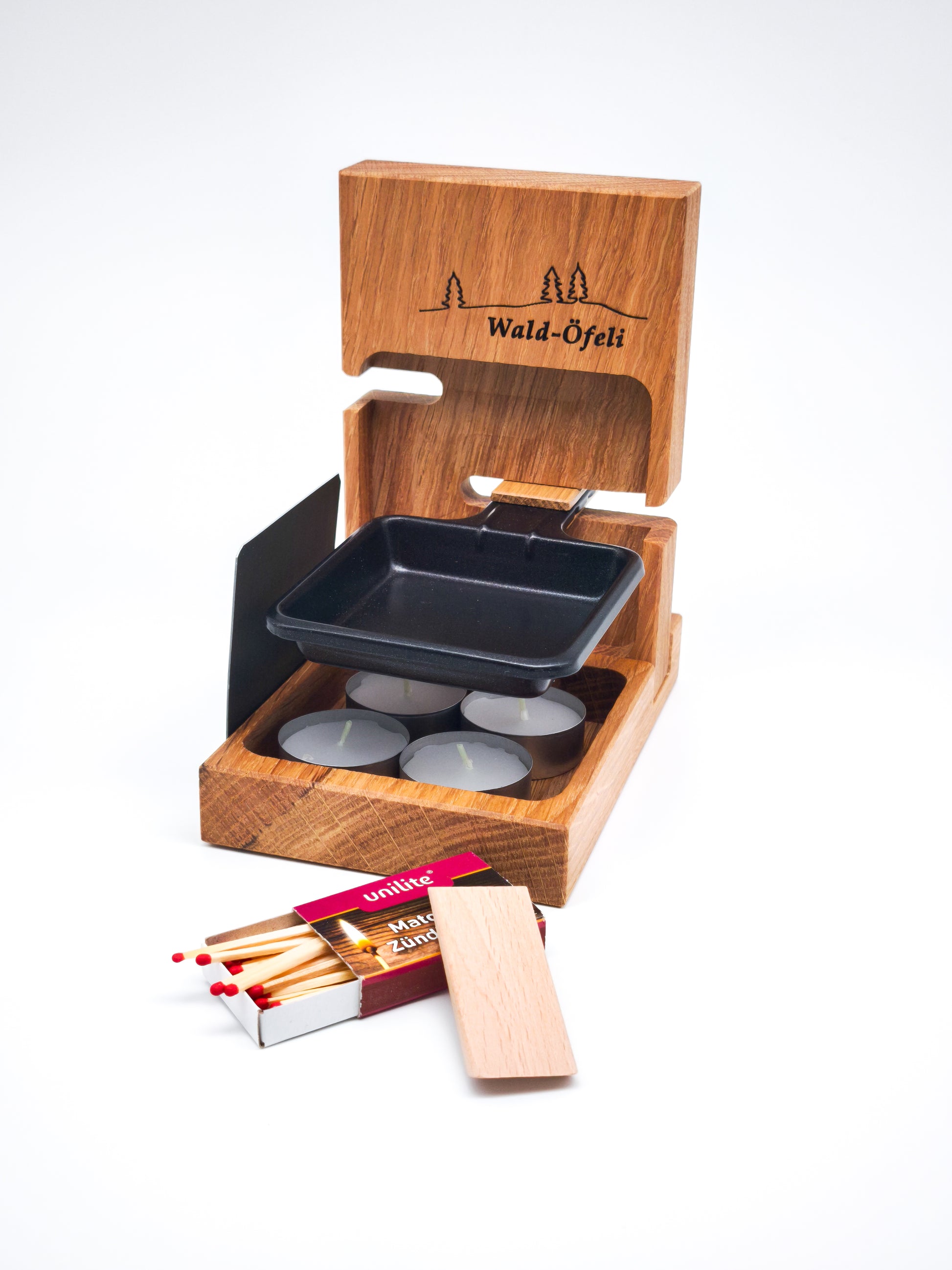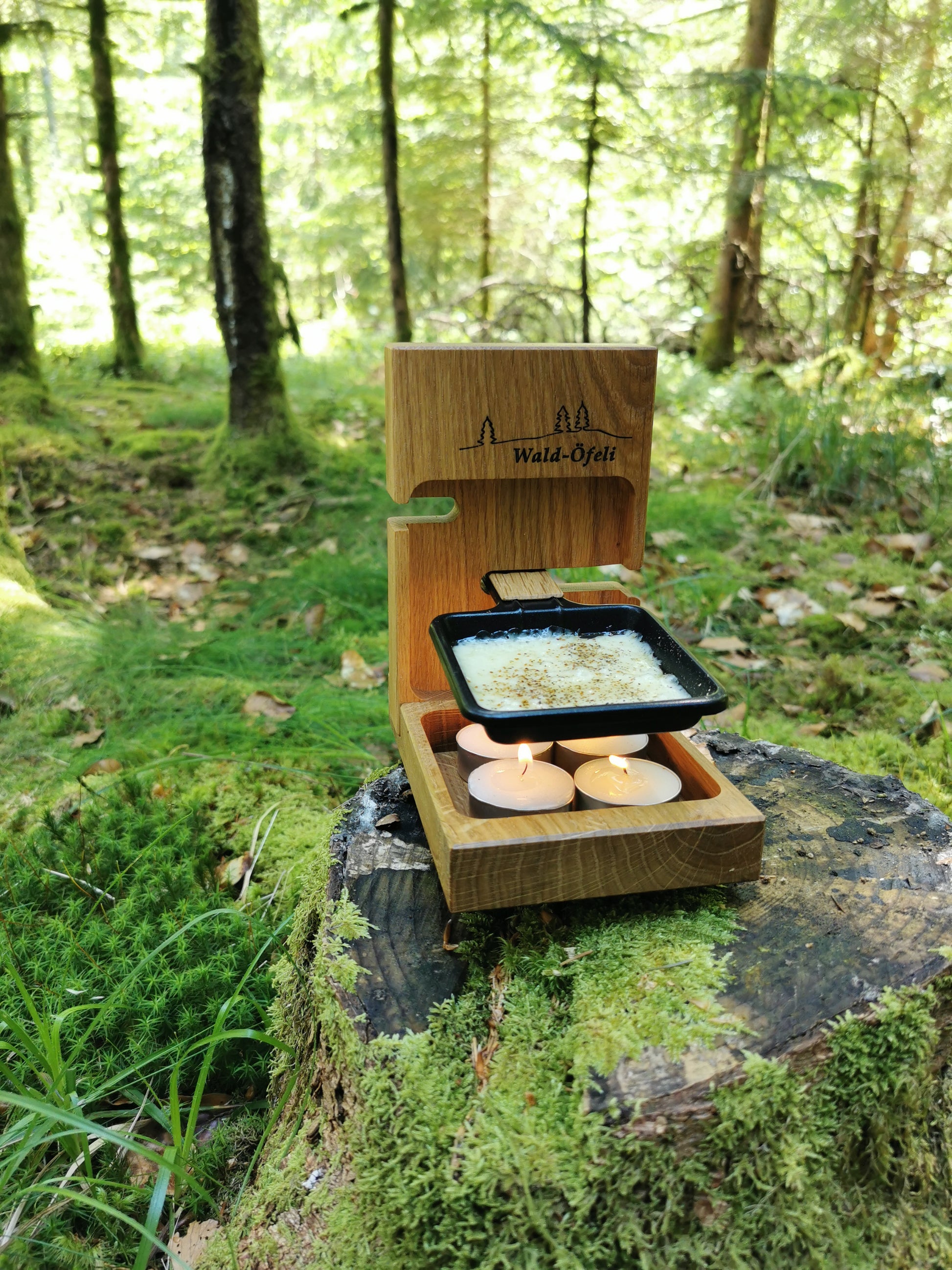 Das Wald-Öfeli ist die perfekte Kombination aus Holz, Design und Genuss. Stromlos präsentiert sich das Öfeli in jeder Location romantisch und ermöglicht einem das Zubereiten leckerer Speisen über Kerzenflammen.